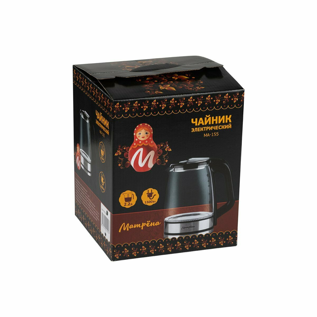 | Дополнительная информация | объем 2,2 л, корпус из термостойкого стекла, шкала уровня воды, внутренняя подсветка, закрытый нагревательный элемент из нержавеющей стали, поворот на подставке 360°, защита от работы без воды, автоматический выключатель, место для хранения шнура, мощность 1500 Вт, длина шнура 59 см |
