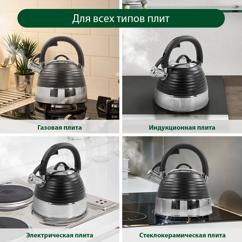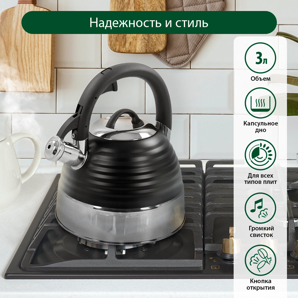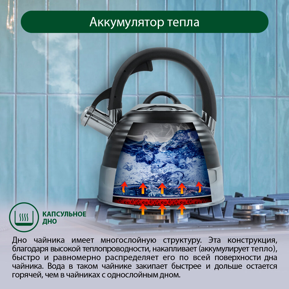 Купить Чайник металлический со свистком MARTA MT-3098 капсульное дно черный матовый с доставкой по всей России.