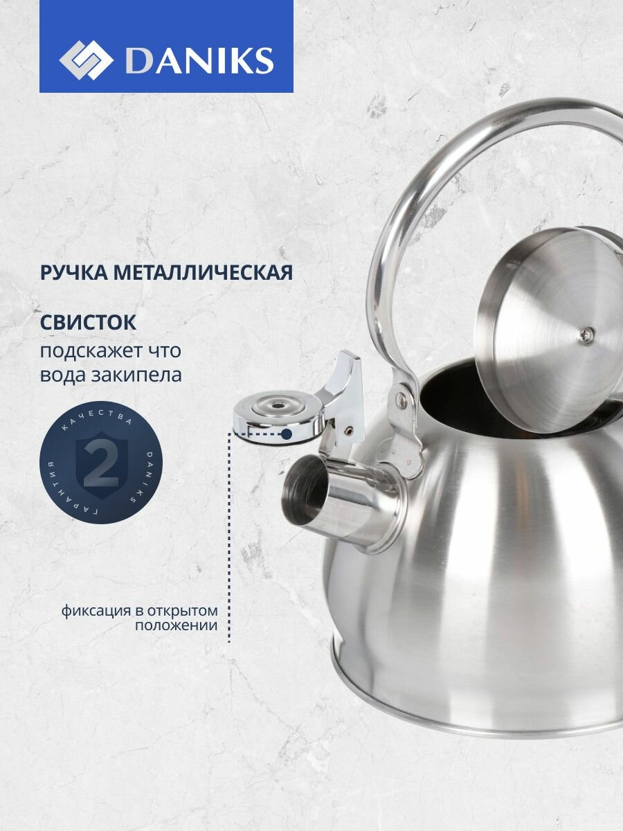 Компактный металлический чайник идеально подходит для совместного чаепития всей семьей, в кругу друзей. Благодаря практичной ручке, наливать кипяток в чашку очень удобно. Крышка открывается легко и быстро. Если вода в чайнике закипела, то об этом сообщит свисток, расположенный на носике.
