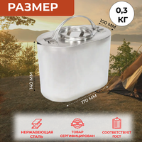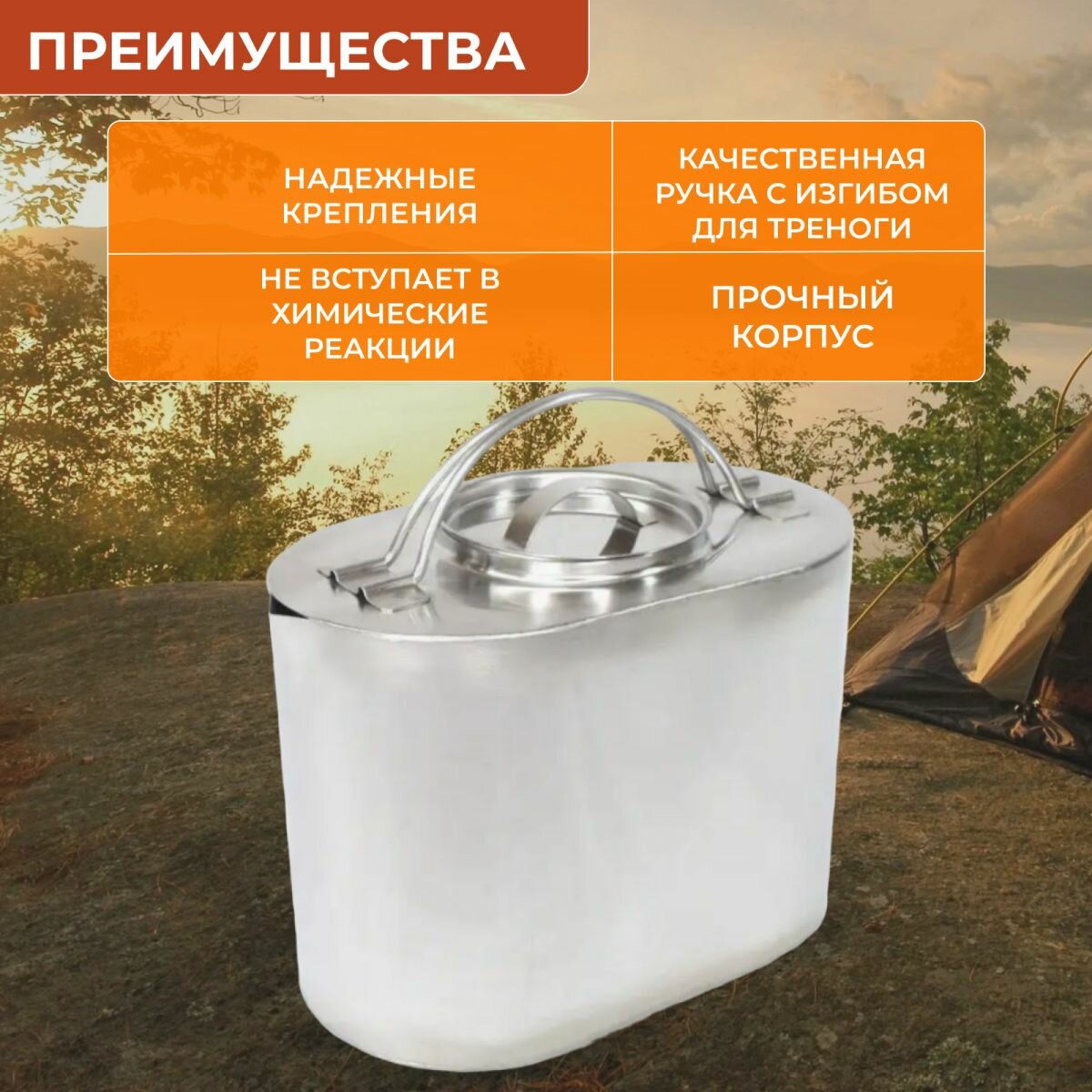 Чайник из пищевой нержавеющей стали (AISI 304) надежен, легок и практичен, проверен многолетней историей. Чайник туристический имеет обтекаемую форму и хорошую теплопроводимость, обеспечивает равномерный и быстрый нагрев содержимого. Идеально подходит для приготовления пищи на открытом огне или горелке. В комплекте идет крышка с ручкой. Костровой чайник с крышкой – это незаменимая посуда для любителей охоты, рыбалки, кемпинга, туризма. Рекомендация: перед первым использованием чайника необходимо его промыть средством для мытья посуды. Предназначен для походов, рыбалки и отдыха на природе (пикника). Туристическая посуда сертифицирована. Швы сварные, сварка выполнена в аргоновой среде без применения электродов или флюсов. Толщина 0,5 мм.