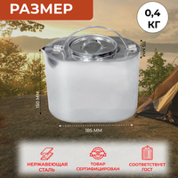 Чайник из пищевой нержавеющей стали (AISI 304) надежен, легок и практичен, проверен многолетней историей. Чайник туристический имеет обтекаемую форму и хорошую теплопроводимость, обеспечивает равномерный и быстрый нагрев содержимого. Идеально подходит для приготовления пищи на открытом огне или горелке. В комплекте идет крышка с ручкой. Костровой чайник с крышкой – это незаменимая посуда для любителей охоты, рыбалки, кемпинга, туризма. Рекомендация: перед первым использованием чайника необходимо его промыть средством для мытья посуды. Предназначен для походов, рыбалки и отдыха на природе (пикника). Туристическая посуда сертифицирована. Швы сварные, сварка выполнена в аргоновой среде без применения электродов или флюсов. Толщина 0,5 мм.