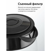 вращение на 360 градусов, индикатор уровня воды, индикация включения, отсек для хранения шнура, фильтр