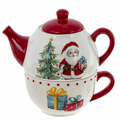 Чайная пара из керамики "Новогодний подарок" включает в себя чайник объемом 500 мл и чашку на 380 мл. Чайник украшен рельефным изображением Санты с ёлочкой, имеет яркую красную крышку, носик и ручку. Чашка декорирована изображением подарков и красной точечной каймой. Удобные ручки добавляют дополнительный комфорт. Идеально для новогоднего чаепития и подарка для близких!