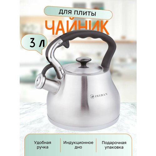 Чайник со свистком; Объём: 3,0л; Материал: нержавеющая сталь; 3-x слойное капсулированное индукционное дно; Матовая полировка; Фиксированная комбинированная ручка; Курковый механизм для поднятия носика-свистка; Свистит при закипании воды; Подарочная упаковка.