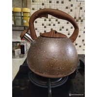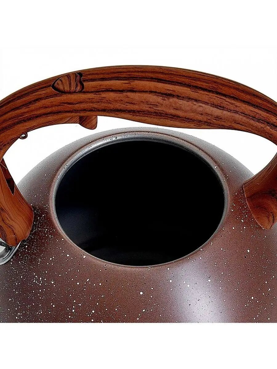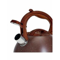 Чайник из нержавеющей стали со свистком. Термосберегающее индукционное дно. Термостойкая бакелитовая ручка с противоскользящим покрытием и с кнопкой для открывания носика. Цвет ручки: темное дерево. Пригоден для использования на всех типах кухонных плит.