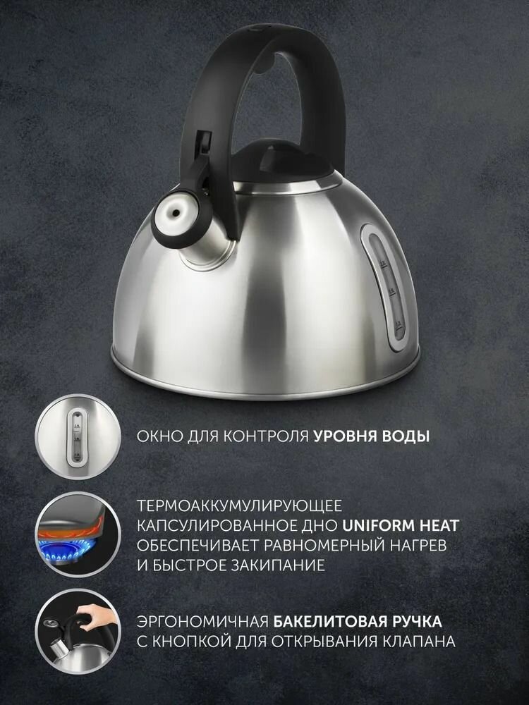Эргономичная бакелитовая ручка с покрытием Soft-touch не нагревается и не скользит, в отличие от ручек из пластика, что гарантирует безопасность во время использования. Съемная крышка обеспечивает легкость наполнения чайника водой и удобный доступ для мытья посуды. Клапан на носике легко открывается с помощью кнопки на ручке. Большой обьем посуды (3 литра) позволяет приготовить горячие напитки для всей семьи и гостей.