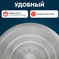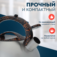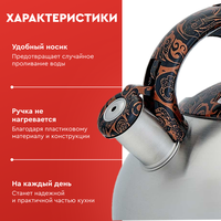 Металлический чайник оснащен свистком, кнопкой открывания носика и нейлоновой ручкой с текстурой дерева и противоскользящим покрытием. Это делает его удобным и безопасным в использовании.