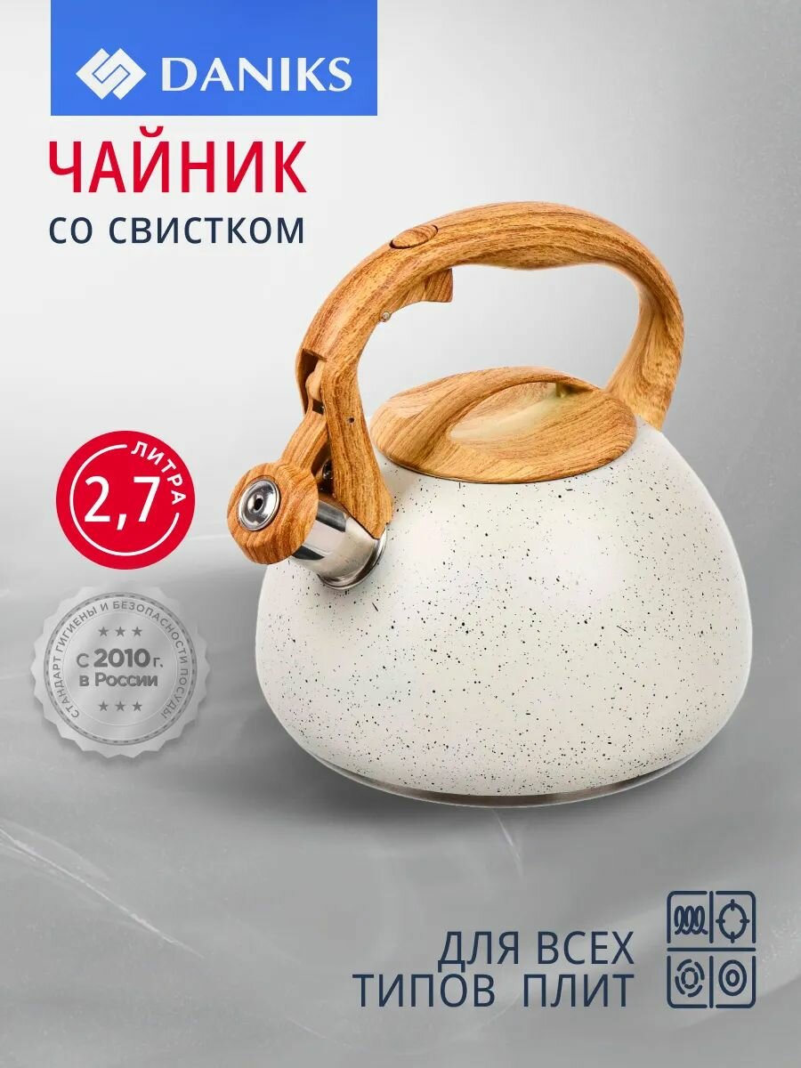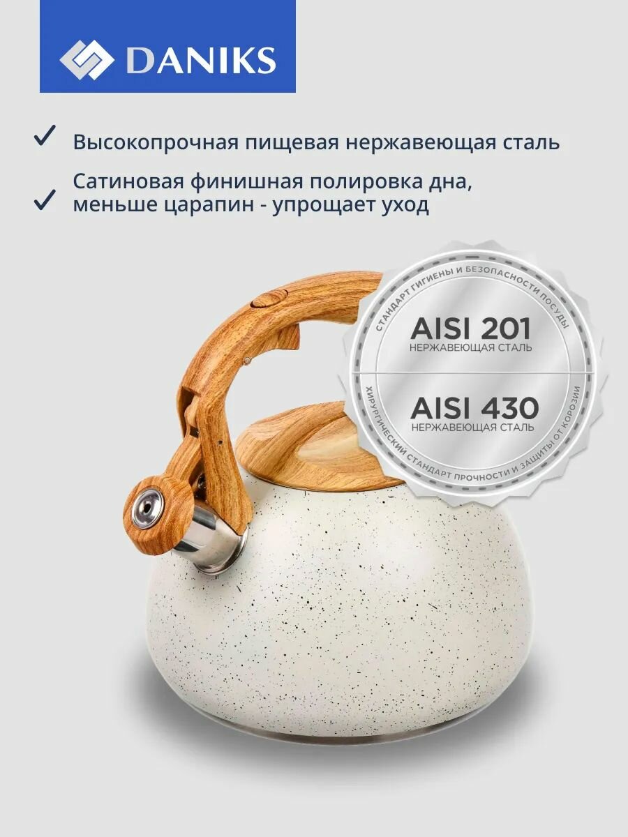 Чайник со свистком Daniks - традиционный элемент кухни. Выглядит стильно и привлекательно, благодаря лаконичному дизайну он легко впишется в разнообразные интерьеры.