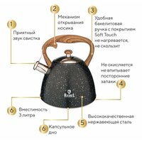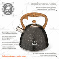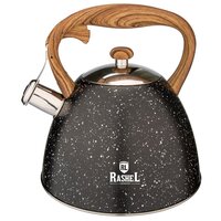 Чайник со свистком из нержавеющей стали Rashel 3л для газовой, электрической и индукционной плиты. Чайник со свистком из нержавеющей стали 3 литра- идеальное решение для вас. Чайник для плиты имеет бакелитовую ручку с прорезиненным покрытием с рычагом для открывания носика. Эргономичная комбинированная фиксированная ручка с покрытием "soft-touch". Чайник для плиты газовой имеет удобный курковый механизм.