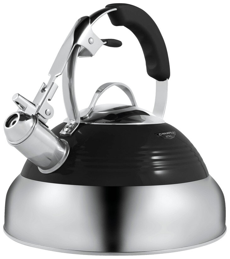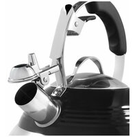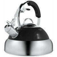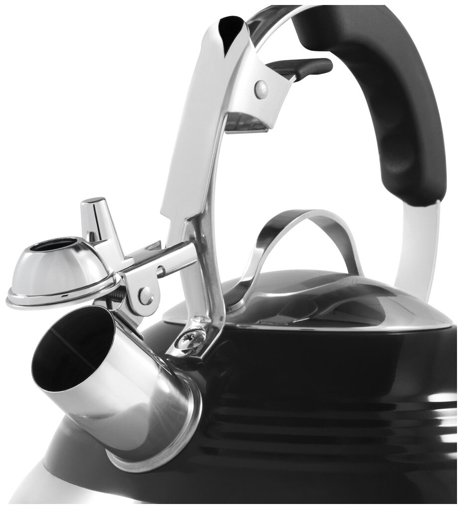 Металлический корпус из самой качественной стали. Верхняя часть выкрашена в черный цвет, нижняя – полированный металл. Металлическая крышка с гравировкой. Многослойное капсулированное индукционное дно. Ручка чайника имеет накладку из теплоизоляционного пластика в цвет корпуса. Свисток из сплава на основе цинка снабжен специальным механизмом, который поднимает его при наливании воды.