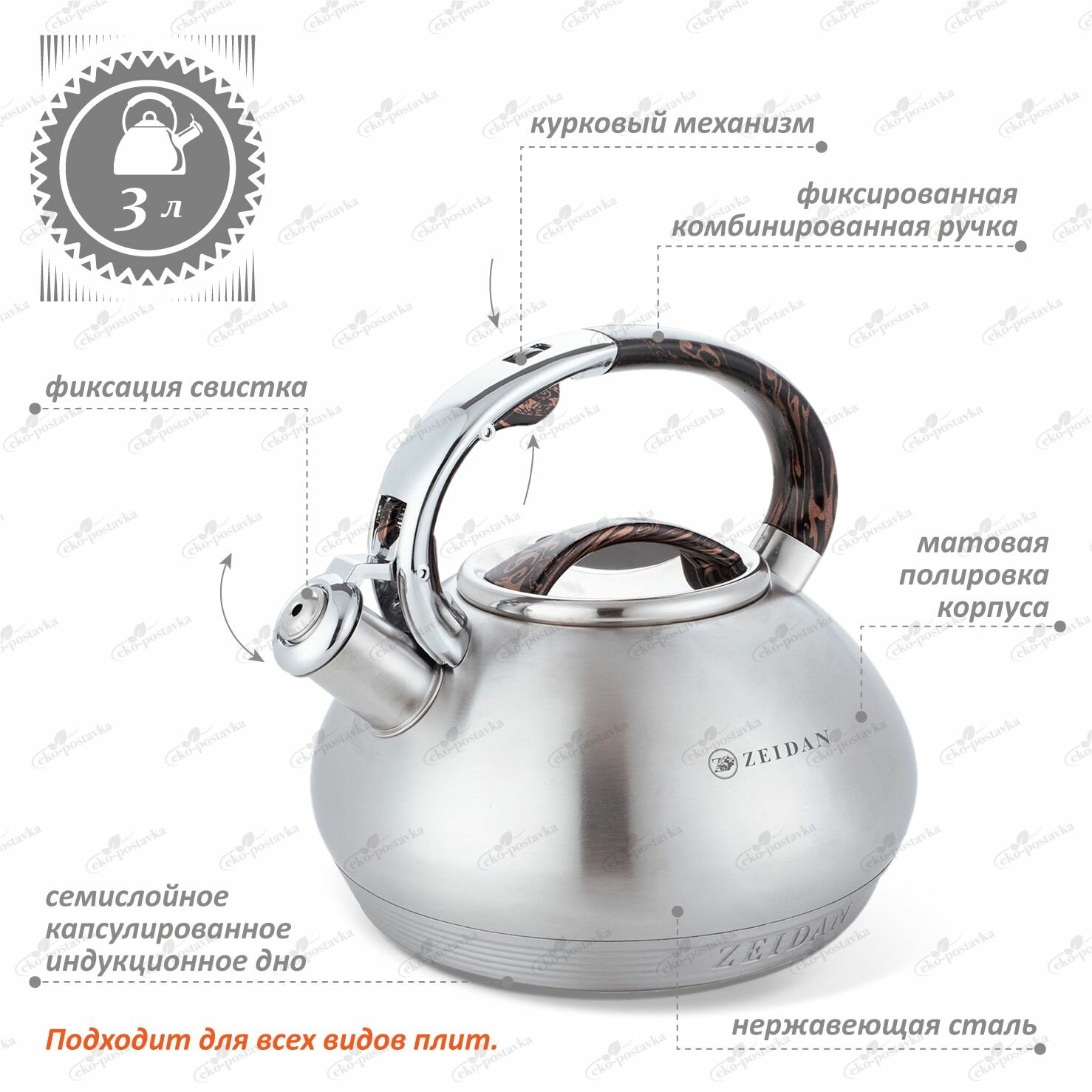 | Особенности | индукционное дно, со свистком, термоизолированная ручка, фильтр в носике |