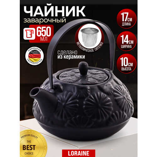 Представляем вашему вниманию заварочный чайник из высококачественной керамики объёмом 650 мл, который станет незаменимым атрибутом вашего домашнего интерьера. Его элегантный черный цвет гармонично вписывается в любой дизайн кухни или гостиной, создавая уютную и комфортную атмосферу. Этот чайник оснащен прочным фильтром из нержавеющей стали, что обеспечивает качественное заваривание чая без посторонних примесей, сохраняя все его вкусовые качества. Благодаря своей конструкции, он идеально подходит для ежедневного использования в домашних условиях, позволяя наслаждаться ароматным чаем в любое время. Простота ухода и долговечность материала делают этот заварочный чайник идеальным выбором для ценителей настоящего чая. Эргономичная ручка заварочного чайника обеспечивает удобный и надежный захват, предотвращая случайные ожоги и делая процесс наливания чая максимально комфортным. Специальная форма носика предотвращает проливание жидкости, обеспечивая аккуратность и чистоту при каждом использовании. Керамический корпус чайника обладает отличными теплоизоляционными свойствами, сохраняя тепло напитка на длительное время. Это позволяет вам наслаждаться горячим чаем дольше, не прибегая к повторному подогреву. Кроме того, керамика не влияет на вкус и аромат чая, позволяя в полной мере раскрыть его богатый букет. Универсальный дизайн чайника позволяет использовать его для заваривания различных сортов чая – от классического черного и зеленого до травяных и фруктовых смесей. Он также прекрасно подходит для приготовления настоев и отваров из лекарственных растений. Этот заварочный чайник станет прекрасным подарком для ваших близких и друзей, ценящих красоту, функциональность и высокое качество. Он подчеркнет ваш безупречный вкус и станет символом заботы о комфорте и уюте в доме.
