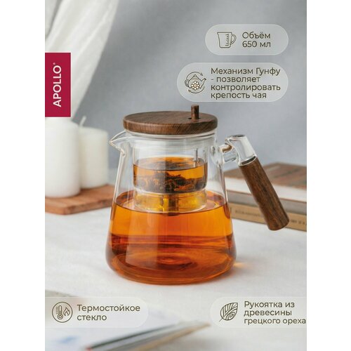 Лаконичный дизайн с прозрачным корпусом и коричневыми акцентами легко вписывается в любой интерьер кухни, а компактный размер делает чайник удобным для хранения в шкафу или на открытой полке. Стеклянный чайник с фильтром Apollo подойдёт для заваривания улунов, зелёного, чёрного и травяного чая, превращая каждую чайную паузу в стильный, продуманный до мелочей ритуал.