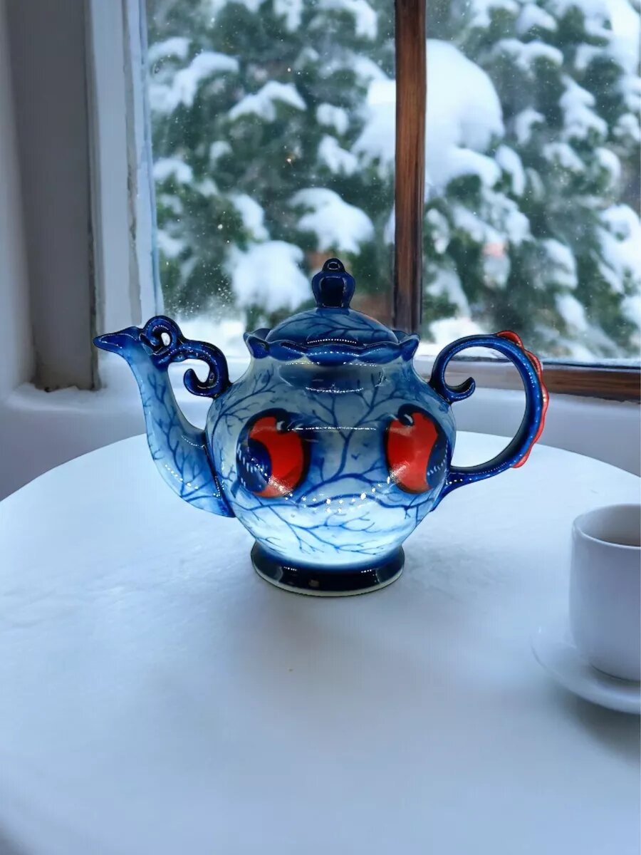 Представляем вашему вниманию уникальный заварочный чайник с изображением снегирей, созданный с любовью и мастерством в известном Гжельском производстве. Это настоящее произведение искусства, полностью росписанное вручную автором.