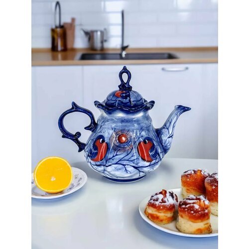 Представляем вам фарфоровый заварочный чайник в традиционной бело-синей c цветными красками росписи Гжель объёмом 650 мл. Этот чайник украсит вашу кухню и станет незаменимым помощником в заваривании чая. На чайнике авторской ручной росписью нанесён рисунок Снегирей, который придаст вашему чаепитию особый шарм и уют. Выполненный из качественного фарфора, этот чайник прослужит вам долгие годы и станет настоящим украшением вашего дома. Покупайте сейчас и наслаждайтесь чаепитием в компании своих близких и друзей!