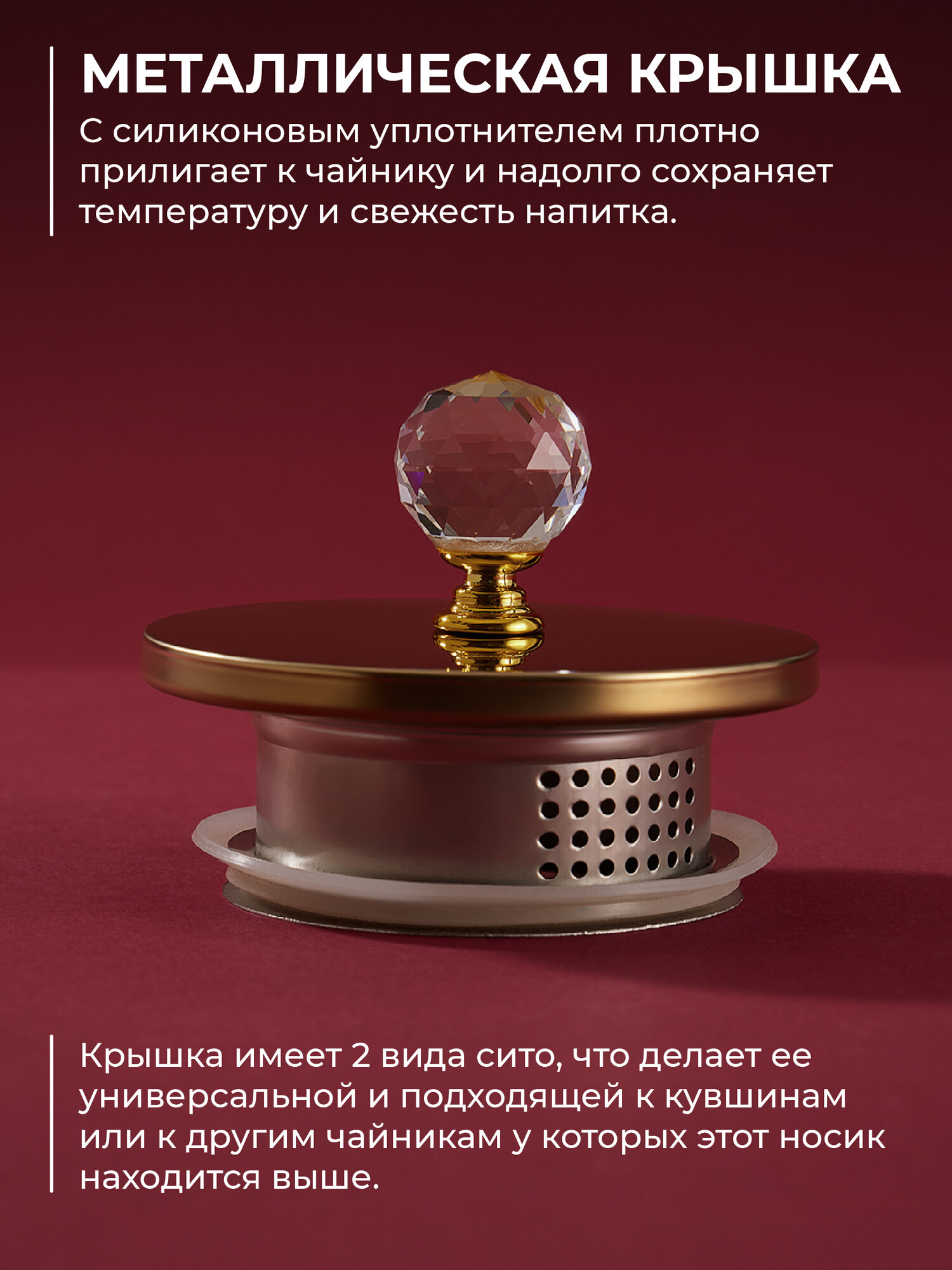 Железная крышка с силиконовым уплотнителем надежно фиксируется на стеклянном заварнике, предотвращая проливание и сохраняя аромат напитка. В дополнение к великолепной функциональности, чайник Cristallo упакован в роскошную цветную картонную коробку, что делает его идеальным подарком для ценителей красоты и комфорта.