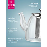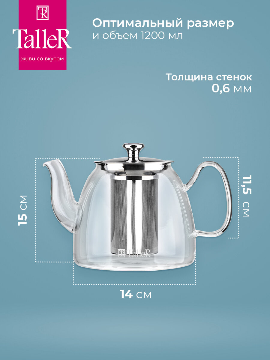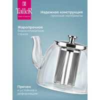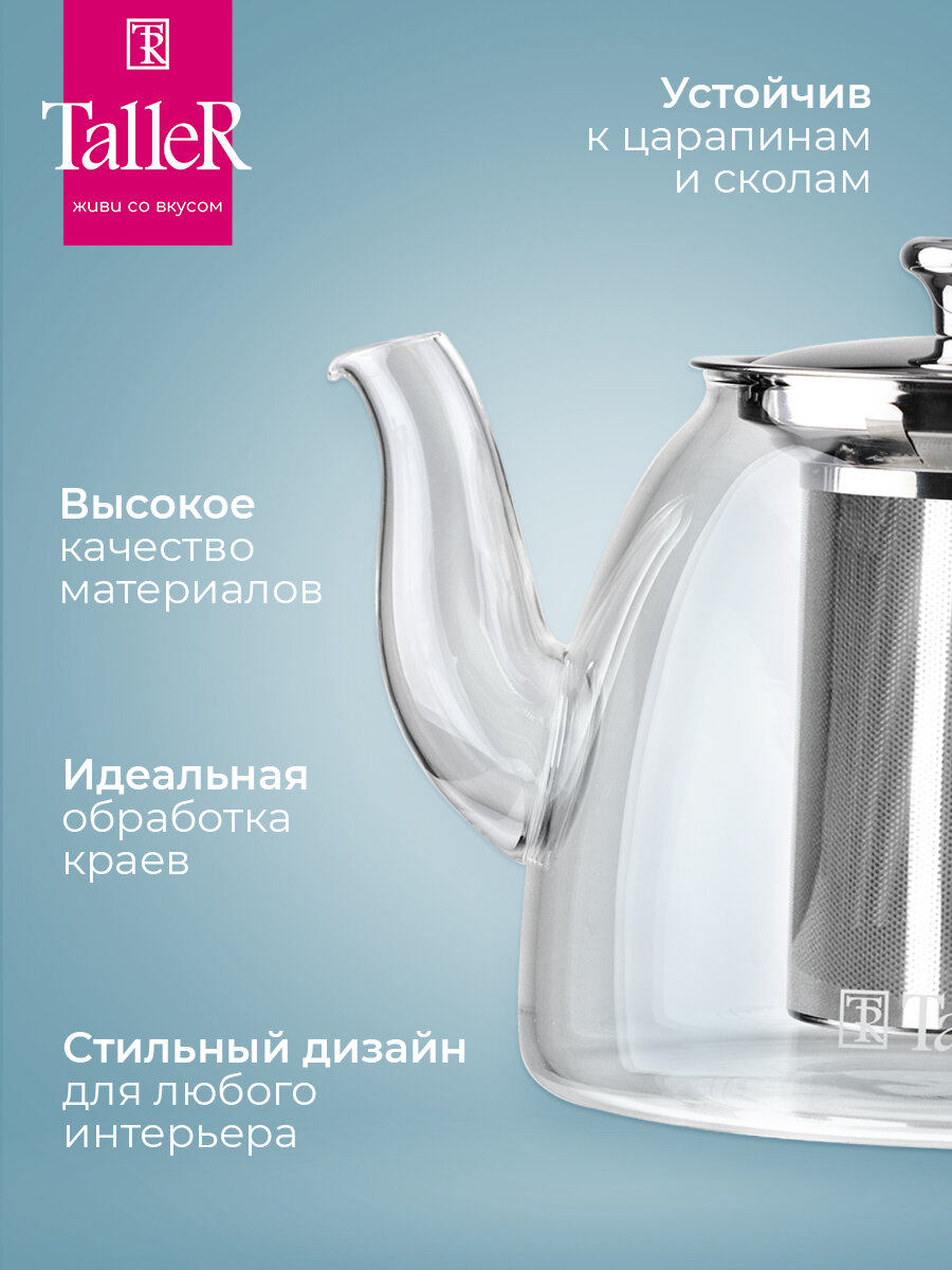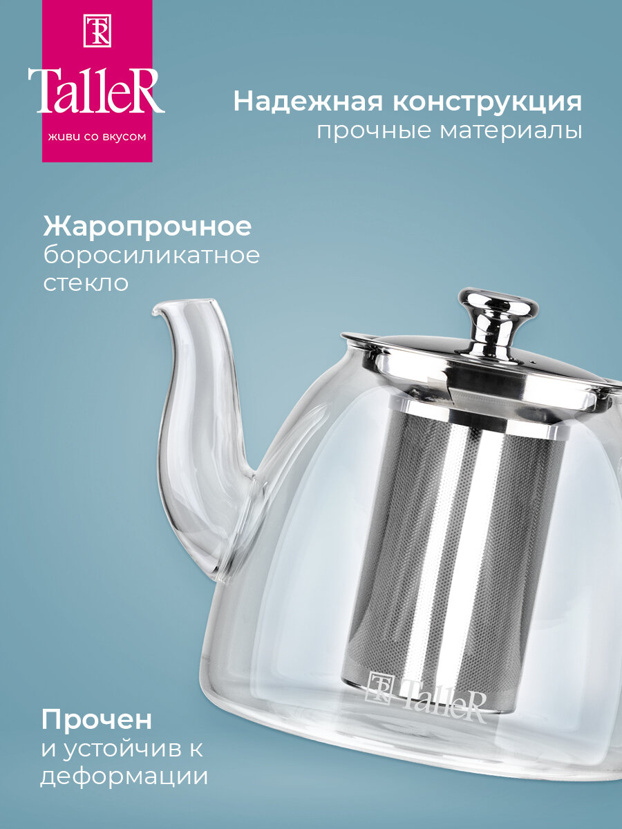 Чайник изготовлен из термостойкого боросиликатного стекла:- жароустойчиво, поэтому напиток долго сохраняется горячим;- устойчиво к появлению царапин и сколов;- не мутнеет и не впитывают запахов;- устойчиво к тепловому удару благодаря низкому коэффициенту расширения. Съемный фильтр для заваривания со складной ручкой выполнен из высококачественной нержавеющей стали марки 18/10 (AISI 304) и удобен в уходе. Идеальная обработка краев предметов и высокое качество полировки. Форма носика препятствует образованию подтеков. Ручка на крышке выполнена из пищевого пластика, что обеспечивает комфортное использование чайника, когда он заполнен горячей водой. Пригоден для мойки в посудомоечной машине. При уходе за изделием не используйте агрессивные моющие средства или средства, содержащие абразивные компоненты.
