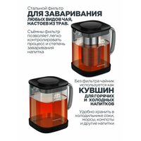 Чайник выполнен из жаропрочного стекла, что позволяет использовать его на газовых и электрических плитах, а также в микроволновой печи. Это делает его удобным и практичным в использовании.