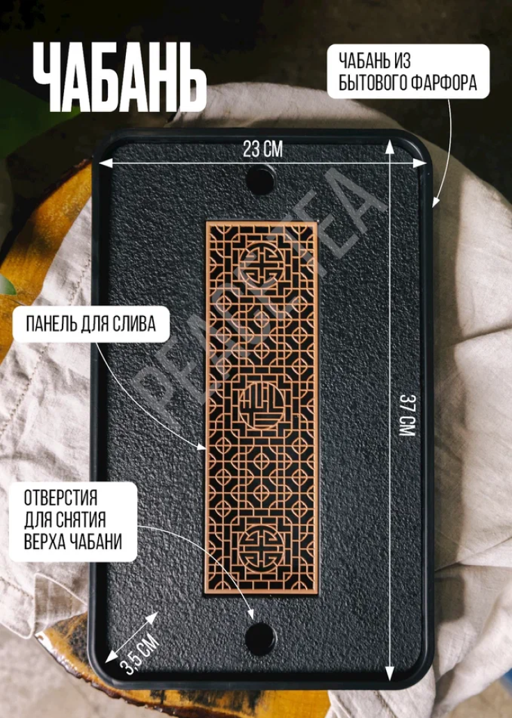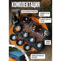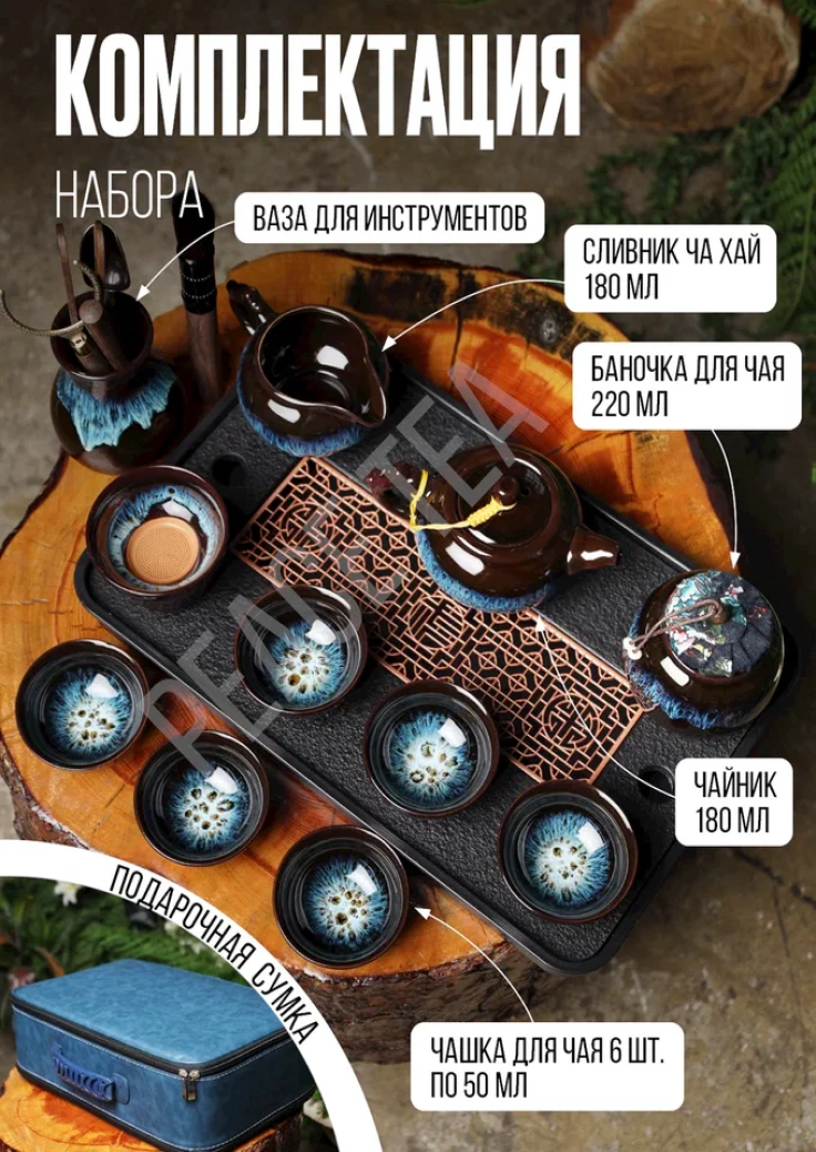 Набор имеет 6 керамических пиал, заварочный чайник 180 мл , сливник 180 мл, баночка для хранения чая , Ваза для хранения интструментов , чайная тряпочка , Чайный поднос Чабань.