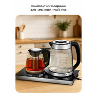 | Особенности | вращение на 360 градусов, дисплей, заварочный фильтр, заварочный чайник, индикатор уровня воды, индикация включения, сенсорное управление, съемная крышка |