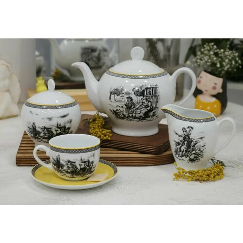 Чайный сервиз на 6 персон "кантри вилладж" из 16 предметов:- 6 чайных чашек 150 мл- 6 блюдец- чайник 900мл- сахарница 355мл - 1 молочник 290мл. Чайный сервиз - красивая посуда , вместе с которой можно насладиться чашечкой ароматного чая в компании друзей и близких. Набор кружек для чая с блюдцами подарит приятные впечатления от чаепития. Чайный набор выполнен из высококачественного фарфора знакомого всем как шпатевый, благодаря работе мастеров фарфор COUNTRY VILLAGE не уступает традиционному французскому фарфору в прозрачности, белизне и прочности, но при этом гораздо дешевле и выгоднее. Если вам нравятся чайные сервизы, которые служат десятилетиями и не выходят из моды, лучший выбор - посуда для кухни из фарфора в классическом дизайне. Такой сервиз чайный не только красив, но и практичен. Чайные сервизы из фарфора легкие и тонкие, но прочные и хорошо сохраняют тепло. В материале практически нет пор, поэтому чайные чашки при всей изящности не бьются при падении на мягкую поверхность и незначительных ударах. Чайный набор посуды рекомендуется мыть вручную без использования агрессивных моющих средств. Набор кружек для чая нельзя разогревать в СВЧ-печи. Набор для чаепития поставляется в подарочной упаковке. Набор чашек для чая станет отличным подарком на новый год, день рождения и любой другой праздник!