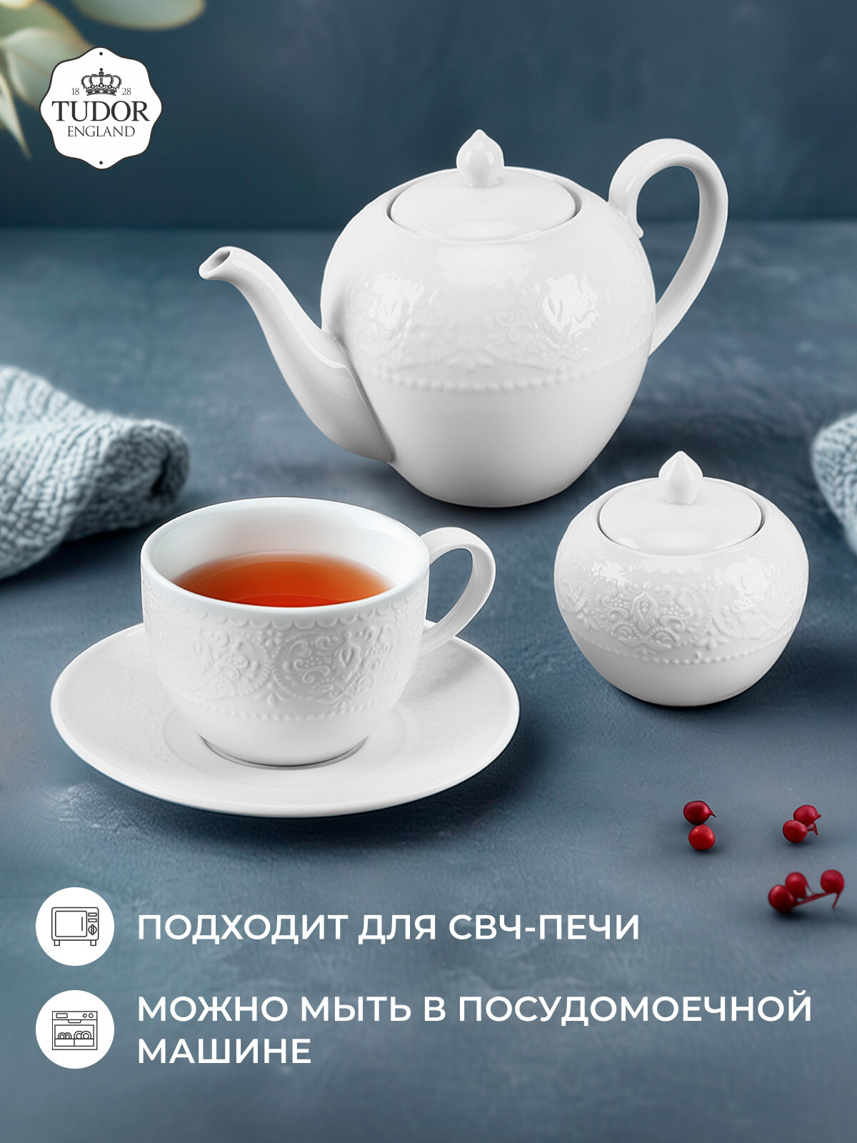 Чайный сервиз Tudor England состоит из 14 предметов на 6 персон. Коллекция Royal Whitehall изящная, привлекательная, ажурная, белоснежная и очень практичная. Все тарелки из этой коллекции можно мыть в посудомоечной машине и использовать в микроволновых печах. Фарфор Tudor England обладает такими характеристиками как: укрепленный край от сколов, особо прочная глазурь, минимальная пористость, практичность и долговечность. Это стильный выбор для сервировки вашего стола. В наборе: чайные чашки 310 мл - 6 шт, блюдца 16 см - 6 шт, заварочный чайник 1 л - 1 шт, сахарница 220 мл - 1 шт