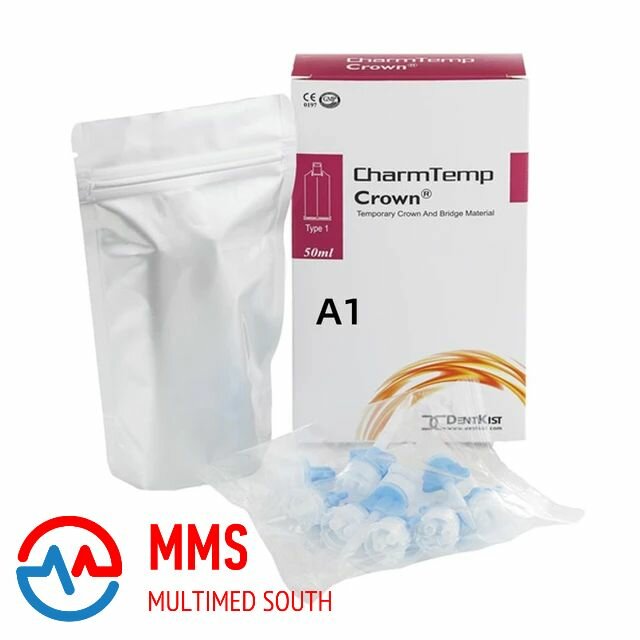 CharmTemp Crown нестерильный, состоит из двух компонентов: основы и катализатора. Компоненты в виде пасты заправлены в двойной шприц (картридж). В одном шприце картриджа – основа, в другом - катализатор. Задняя часть картриджа представляет собой поршневую конструкцию для установки смесительного пистолета. Показания к применению- для изготовления временных коронок и мостов. Компоненты материала, заправленные в картридж, для использования по показаниям предварительно механически смешивают. Механическое смешивание компонентов материала обеспечивается конструкцией картриджа и происходит путем выдавливания смесительным пистолетом компонентов в соотношении 1:1 по объему из картриджа и продавливания их через специальную насадку (смесительный наконечник), из которой выходит однородная смесь. Материал CharmTemp Crown относится к самоотверждаемым материалам, отверждение которых происходит под действием химических агентов при комнатной температуре или температуре ротовой полости. Материал обладает цветостойкостью (не изменят цвет). Расцветку (оттенок) материала CharmTemp Crown после отверждения определяют по электронному прибору для определения цвета по шкале «Вита».