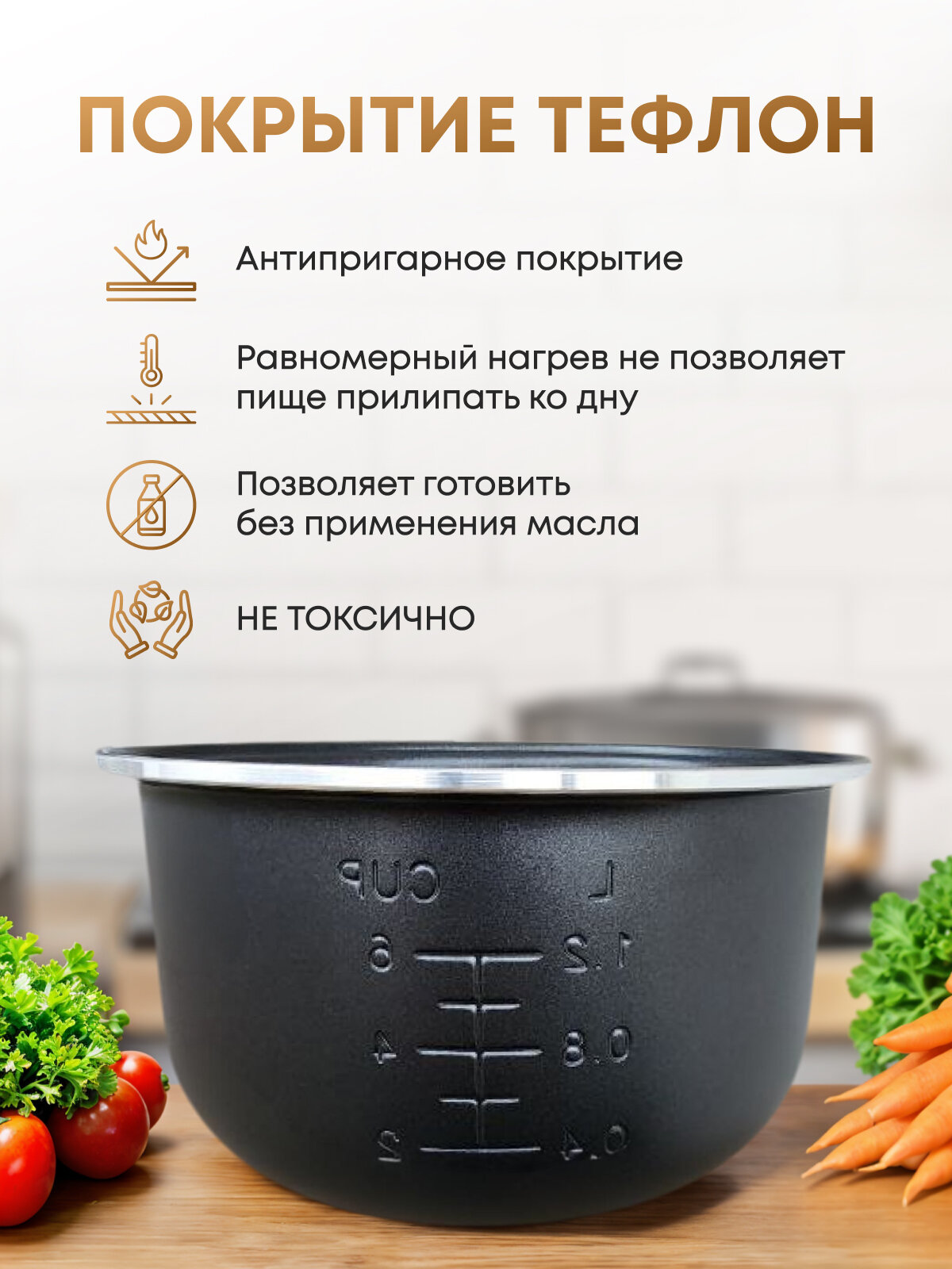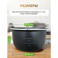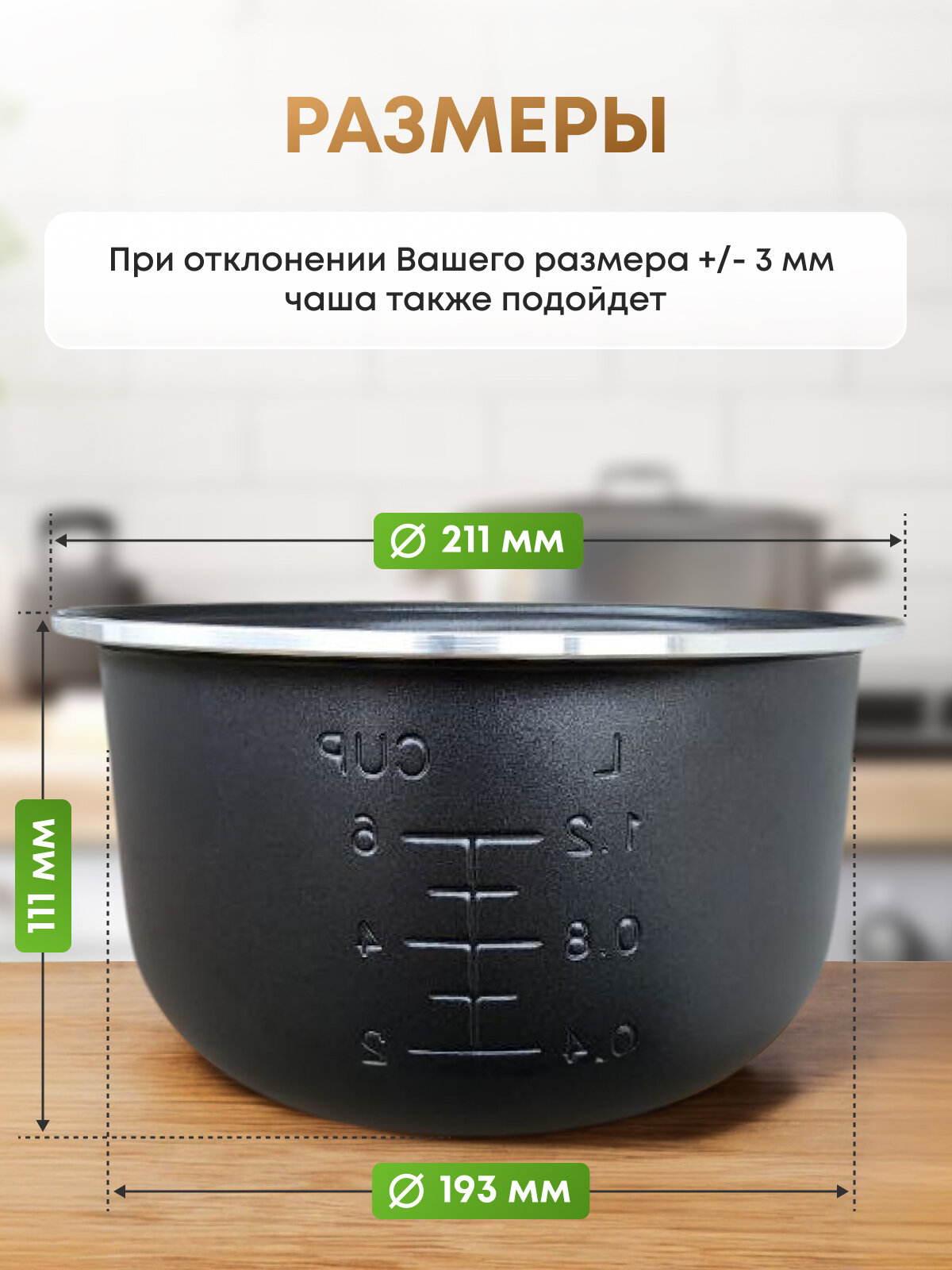 Чаша подойдет для моделей Redmond: RB-A300, RB-C302, RB-C305, RIP-A1, RMC-M10, RMC-M11, RMC-M12, RMC-M13, RMC-M4505; Polaris PMC 0308AD, PMC 0310AD, PMC 0347AD, PMC 0349AD, PMC 0350AD, PMC 0351 AD, PMC 0360D, PMC 0364AD, PMC 0365AD, PMC 0366AD; Panasonic SR-DE102, SR-TMH102, SR-TMPN10; MYSTERY: MCM-1016, MCM-1018, MCM-1017; VITESSE : VS-522, VS-584; MARTA: MT-1965, MT-4324; LUMME: LU-1432, LU-1434; SCARLETT: SC-MC410S09 и других. Чаша для мультиварки 3 л универсальная с антипригарным тефлоновым покрытием объёмом 3 литра. Размеры: высота 111 мм, диаметр верхний 211 мм, диаметр нижний 193 мм. Вес чаши - 394грамма. Для того, чтобы понять, подходит ли Вам наша чаша, изучите список совместимых моделей на фото в карточке товара. Если вы не нашли в списке Вашу модель, измерьте свою старую чашу и сравните ее с нашей, если размеры сходятся, то чаша точно подойдет. Нержавеющая, запасная кастрюля для мультиварки, скороварки имеет высокотехнологичную многослойную структуру, что позволяет приготовить все, что угодно. Выпечка и другие приготовления блюд будут в одно удовольствие. Чаша для мультиварки 3л имеет деления, что позволяет контролировать объем приготовленной пищи. Чашка для мультиварки позволяет использовать ее для огромного количества мультиварок известных брендов Информацию о совместимости моделей и размеры нашей чаши вы найдете на фото в карточке товара. Если вдруг вы не нашли свою модель в нашем полном списке, не расстраивайтесь. Наша универсальная чаша для мультиварки подходит для огромного ряд моделей, просто измерьте свою старую чашу и сравните ее с нашей и если размеры сходятся смело берите. Вы получите много хороших эмоций от использования нашей чаши для мультиварок! Чаша для мультиварки Redmond 3 л, Чаша для мультиварки Polaris 3 л, Чаша для мультиварки Panasonic 3 л, Чаша для мультиварки Marta 3 л, Чаша для мультиварки Lumme 3 л, Чаша для мультиварки Vitesse 3 л также подходит для Scarlett, Mystery и других.