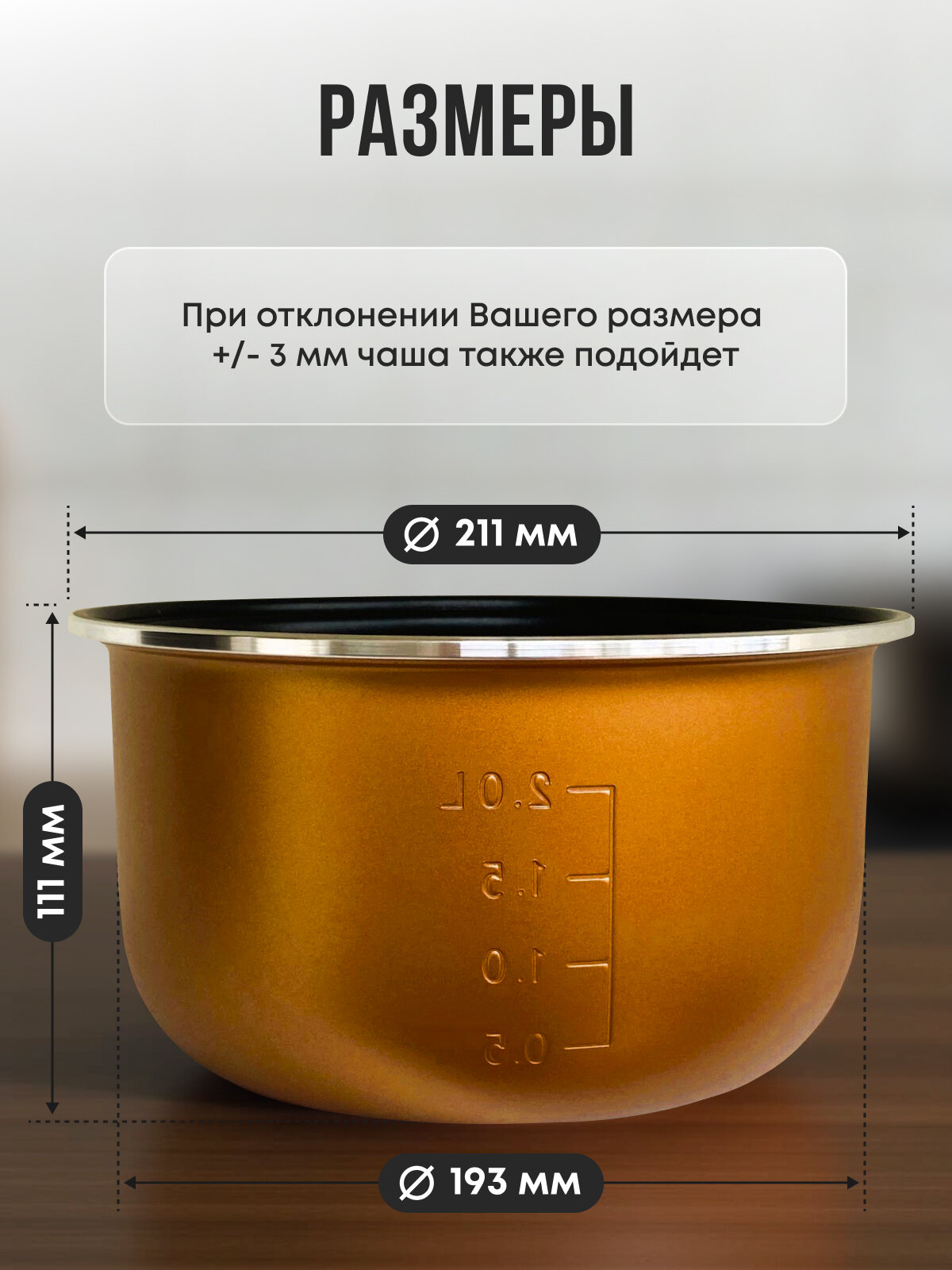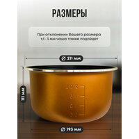 Чаша подойдет для моделей Redmond: RB-A300, RB-C302, RB-C305, RIP-A1, RMC-M10, RMC-M11, RMC-M12, RMC-M13, RMC-M4505; Polaris PMC 0308AD, PMC 0310AD, PMC 0347AD, PMC 0349AD, PMC 0350AD, PMC 0351 AD, PMC 0360D, PMC 0364AD, PMC 0365AD, PMC 0366AD; Panasonic SR-DE102, SR-TMH102, SR-TMPN10; MYSTERY: MCM-1016, MCM-1018, MCM-1017; VITESSE : VS-522, VS-584; MARTA: MT-1965, MT-4324; LUMME: LU-1432, LU-1434; SCARLETT: SC-MC410S09 и других. Чаша для мультиварки 3 л универсальная с антипригарным тефлоновым покрытием объёмом 3 литра. Размеры: высота 111 мм, диаметр верхний 211 мм, диаметр нижний 193 мм. Вес чаши - 394грамма. Для того, чтобы понять, подходит ли Вам наша чаша, изучите список совместимых моделей на фото в карточке товара. Если вы не нашли в списке Вашу модель, измерьте свою старую чашу и сравните ее с нашей, если размеры сходятся, то чаша точно подойдет. Нержавеющая, запасная кастрюля для мультиварки, скороварки имеет высокотехнологичную многослойную структуру, что позволяет приготовить все, что угодно. Выпечка и другие приготовления блюд будут в одно удовольствие. Чаша для мультиварки 3л имеет деления, что позволяет контролировать объем приготовленной пищи. Чашка для мультиварки позволяет использовать ее для огромного количества мультиварок известных брендов Информацию о совместимости моделей и размеры нашей чаши вы найдете на фото в карточке товара. Если вдруг вы не нашли свою модель в нашем полном списке, не расстраивайтесь. Наша универсальная чаша для мультиварки подходит для огромного ряд моделей, просто измерьте свою старую чашу и сравните ее с нашей и если размеры сходятся смело берите. Вы получите много хороших эмоций от использования нашей чаши для мультиварок! Чаша для мультиварки Redmond 3 л, Чаша для мультиварки Polaris 3 л, Чаша для мультиварки Panasonic 3 л, Чаша для мультиварки Marta 3 л, Чаша для мультиварки Lumme 3 л, Чаша для мультиварки Vitesse 3 л также подходит для Scarlett, Mystery и других.