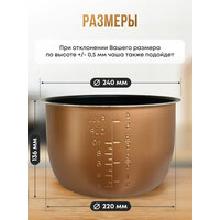 Совместима с моделями Redmond: RIP-A4. RIP-S4. RMC-M110. RMC-PM180. RMC-PM190. RMC-PM381. RMC-PM388, RMC-PM507. RB-C520. RB-5520. RB-A523, RB-A573. RMC-M4504, RMC-PM4506. RMC-PM4507; RIVER: MPC013; PHILIPS: HD2103/49. HD2103/60. HD2103/65. HD2105/46. HD2105/S0. HD2132/60. HD2133/50. HD2136/50. HD2136/65, HD2171/50, HD2172/50, HD2173/03, HD2173/03 AVANCE COLLECTION. HD2175/50, HD2179/50; Moulinex CE503132; ARC: DSB50-900F. DSBS0-900F1. DSB50-900B9; LANDLIFE: YBD50-90A, YBD50-90A1; LUMME: RPC-101; UNIT: USP-1010D. USP-1020D. USP-1040D. USP-1060D. USP-1070D. USP-1090D. USP-1100D; VITESSE: VS 524. VS S25. VS 526. VS 3002. VS 3003. VS 3004. Наша для мультиварки 5 л универсальная с антипригарным тефлоновым покрытием объёмом 5 литров. Размеры: высота 136 мм, диаметр верхний 240 мм, диаметр нижний 220 мм. Вес чаши - 600 грамм. Для того, чтобы понять, подходит ли Вам наша чаша, изучите список совместимых моделей на фото в карточке товара. Если вы не нашли в списке Вашу модель, измерьте свою старую чашу и сравните ее с нашей, если размеры сходятся, то чаша точно подойдет. Нержавеющая, запасная кастрюля для мультиварки, скороварки имеет высокотехнологичную многослойную структуру, что позволяет приготовить все, что угодно. Выпечка и другие приготовления блюд будут в одно удовольствие. Чаша для мультиварки 5л имеет деления, что позволяет контролировать объем приготовленной пищи. Чашка для мультиварки позволяет использовать ее для огромного количества мультиварок известных брендов. Информацию о совместимости моделей и размеры нашей чаши вы найдете на фото в карточке товара. Вы получите много хороших эмоций от использования нашей чаши для мультиварок!