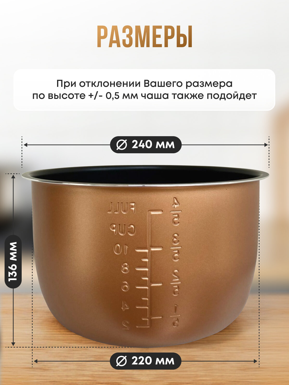 Чаша для мультиварки Redmond 5 л, чаша для мультиварки Lumme 5 л, чаша для мультиварки Philips 5 л, Чаша для мультиварки Unit 5 л, Чаша для мультиварки Brand 5 л, Чаша для мультиварки Mystery 5 л, Чаша для мультиварки Vitesse 5 л, также подходит для Polaris, Marta, Sakura, Daewoo, Supra, Vitek и других.