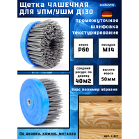 Щетка чашечная нейлон 1-017 130 мм; P60 по дереву для браширования на УПМ/УШМ OSBORN 614.916-9311 для обработки стен из дерева, браширования, текстурирования и шлифовки. Идеальны для обработки вертикальных поверхностей из древесины, например стен из бревна, бруса, вагонки, планкена, имитации и т. п. Зерно P60 используется для выделения средней глубины текстуры и промежуточной шлифовки после обработки щеткой с металлическим стальным ворсом Применяются на УПМ (угловая полировальная машина) / УШМ (болгарка) с регулятором оборотов. Важно: превышать максимальную скорость работы запрещено. Необходимо работать на рекомендуемой скорости. Параметры работы: 1. Площадь обработки сильно зависит от состояния поверхности до обработки, скорости и интенсивности работы и того, какую вы хотите получить поверхность после. 2. Работать нужно кончиками ворса без сильного давления на инструмент. Вес, кг: 0,37 Длина ворса, мм:50 Диаметр ворса, мм:1,60 Посадочный диаметр, мм: М14 (шаг 2,00) Материал ворса щетки: Полимер абразив (абразивный нейлон) Тип (форма) ворса: Гофрированный (волнистый) Абразив - материал зерна: Карбид кремния - C Максимальная скорость, об/мин:2500 Рекомендуемая рабочая скорость, об/мин:1600