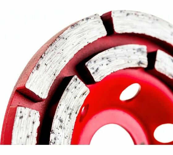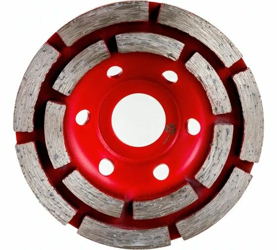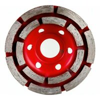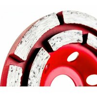Технические характеристики сегментной двухрядной алмазной чашки TRIO-DIAMOND: Вид чашка алмазная Тип двухрядный Тип обработки грубая Посадка 22.2 мм Диаметр 100 мм Вес нетто 0.4 кг Размер алмазного зерна 40-50 мкм