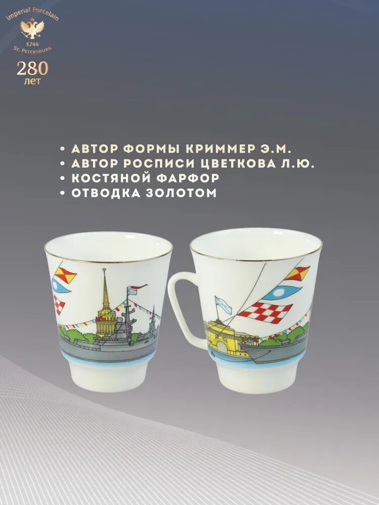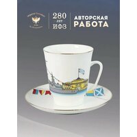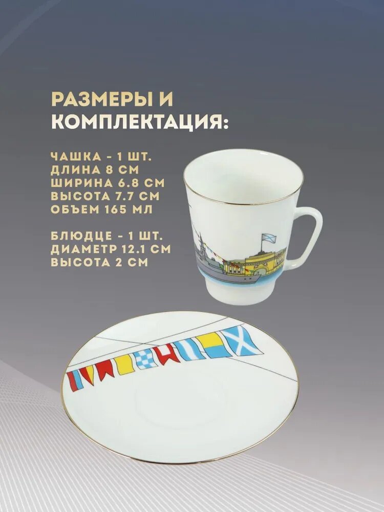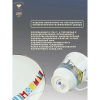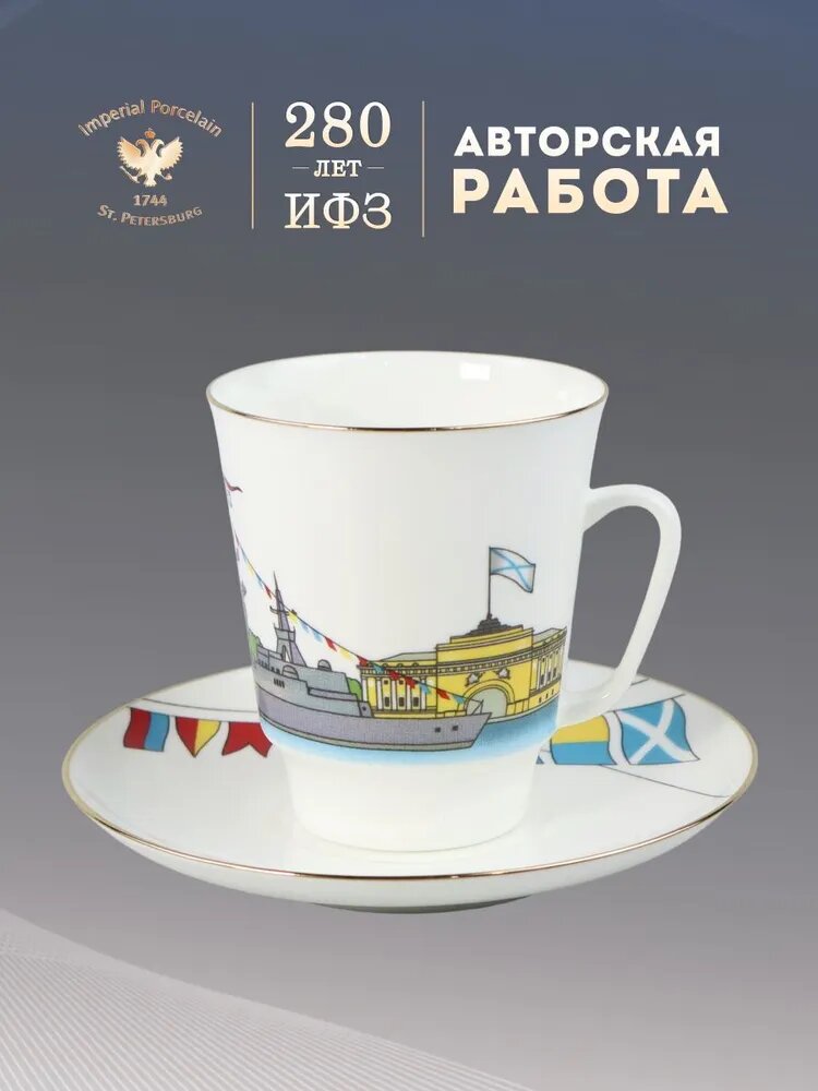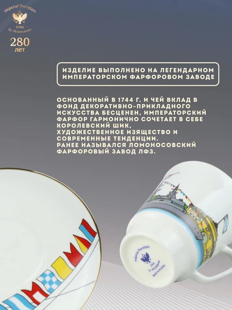 Чашка с блюдцем изготовлена на Императорском фарфоровом заводе (г. Санкт-Петербург) из тонкостенного костяного фарфора. Для декорирования используется надглазурная деколь. Объем чашки - 165 мл, высота - 7.7 см, диаметр блюдца - 12.1 см. Обратите внимание, объем измеряется от дна до верхнего края изделия, полезный объем может быть на 10-15% меньше заявленного производителем.