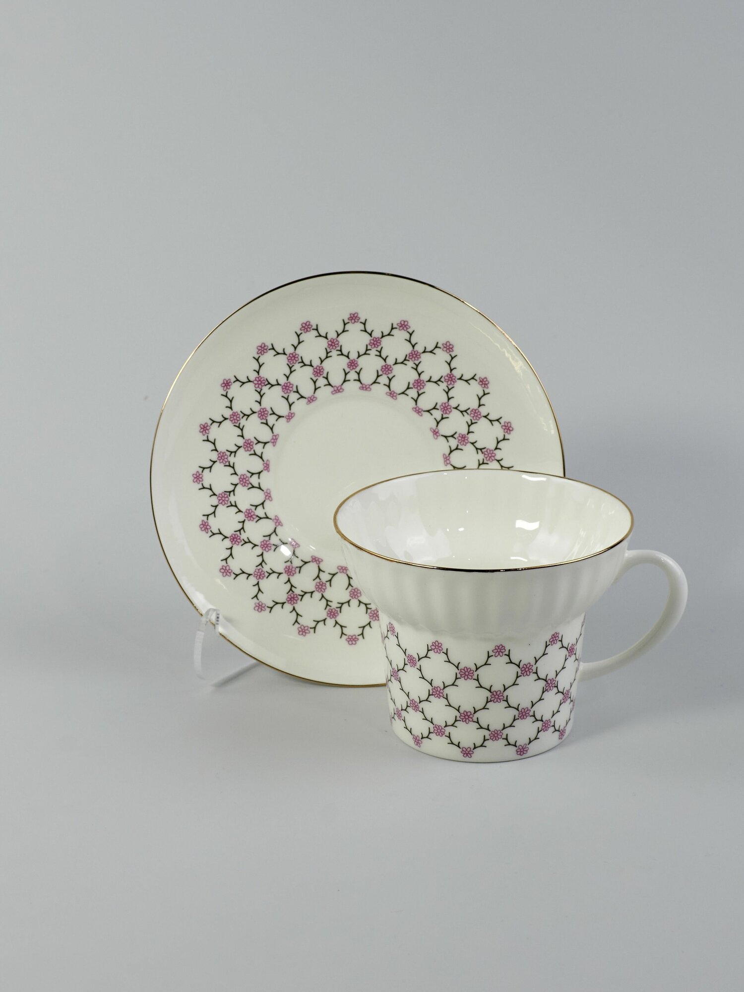 Купить Чайная пара. Императорский фарфоровый завод. Форма «Волна», рисунок «Розовая сетка». Костяной фарфор. 155 мл. с доставкой по всей России.