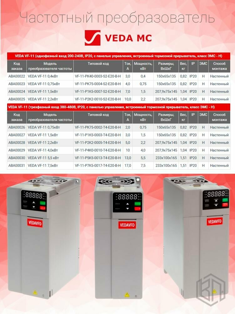 Частотный преобразователь VEDA VF-11-PK75-0002-T4-E20-B-H (ABA00026), 0,75кВт, 380В, 2А: сравнение цен, характеристики, фото, актуальное наличие и цены.