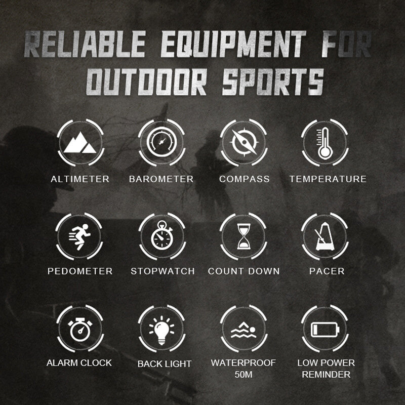 Альтиметр, барометр и компас: Эти спортивные часы оснащены альтиметром, барометром и компасом, что делает их подходящими для различных видов активного отдыха, таких как кемпинг и пешие походы.