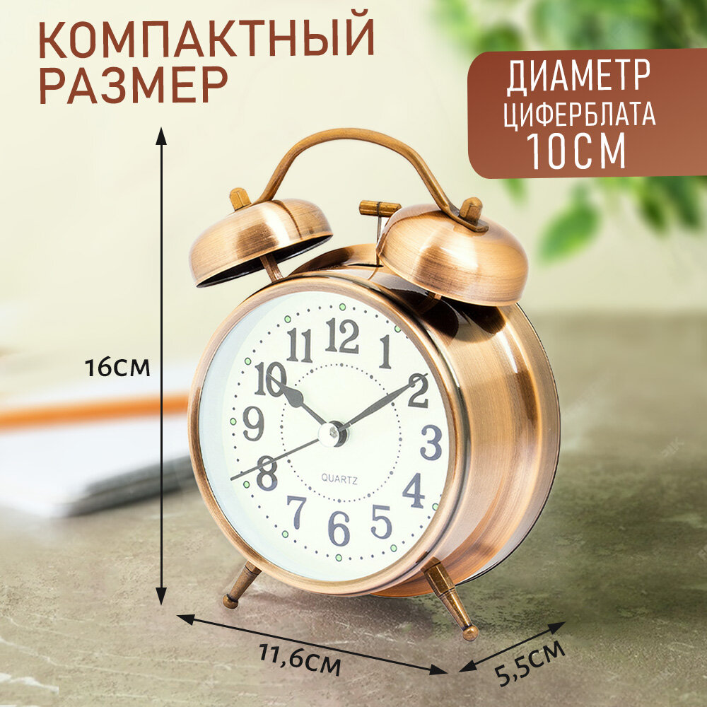 Часы будильник настольные классические D-10 см медный цвет Эврика детские, взрослые, подарочные мужские на 23 февраля, женщине на 8 марта, ребенку, на стол, в спальню