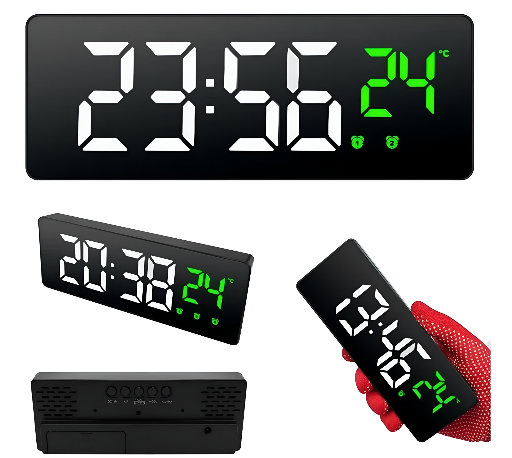 Яркая подсветка c возможностью регулировки. Будильник. Часы работают от батареек или от USB. Особенности: Крупные цифры Яркая подсветка c возможностью регулировки Будильник Отображение температуры и даты Ночной режим (автоматическое изменение яркости в заданное время)