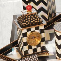 Часы настольные Courtly Check от MacKenzie-Childs. Наш красивый хронометрист коронован великолепной ручкой из искусственной резной киновари и устойчиво стоит на львиных лапах-ножках. Украшен вручную яркими золотыми точками, которые выходят за рамки черных и белых штрихов и обновляют классический черно-белый стиль Courtly Check. Этот привлекательный предмет придает новизны и стильности «наблюдению за часами». Отличный вариант для подарка друзьям.