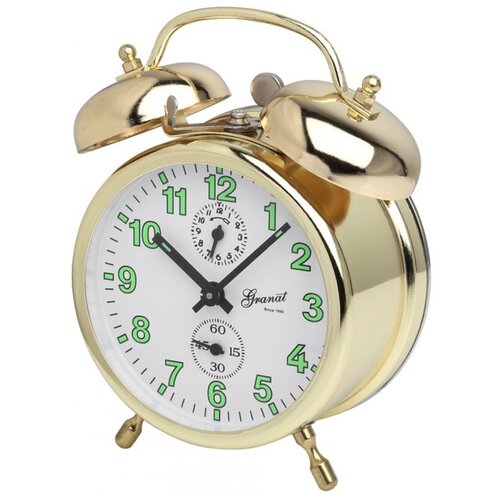 Будильник механический гранат М 208-5 цвет золото. Классическая форма будильника, с колокольчиками сверху и рычагом остановки звонка. Полностью изготовлен из металла. Мерное тиканье механических часов успокаивает и создает неповторимую обстановку уюта и комфорта в доме. Колокольчики и молоточек из металла, поэтому звонок ясный и очень громкий, трудно проспать с таким будильником! Заводить часы нужно каждый день, желательно в одно и тоже время. Циферблат размечен арабскими(русскими) цифрами, контрастный-хорошо читается, стрелки и цифры со светонакопителем-хорошо видно в тёмное время суток. На циферблате есть два дополнительных сектора, верхний указывает время звонка, а нижний отсчитывает секунды. Каждый будильник прошел качественную сборку и регулировку вручную в России. Размер часов: ширина 100, высота 140, глубина 60 мм.