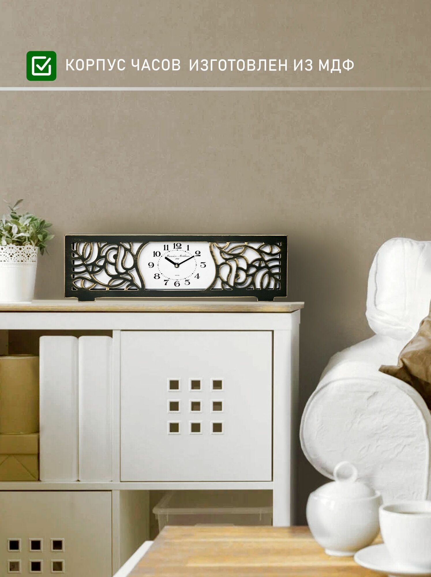 Компания Михаил Москвин, работающая над производством часов уже более 20 лет представляет Вашему вниманию настольные часы из натурального дерева и высококачественного мдф. При производстве наших часов из мы уделяем особое внимание подготовке используемого материала, чтобы обеспечить высокое качество и привлекательный внешний вид изделий. Каждый элемент тщательно отбирается для производства наших часов. Настольные часы не только помогут вам следить за временем, но и станут оригинальным украшением вашего интерьера. Наши классические часы оснащены точным бесшумным кварцевым механизмом. Часы настольные работают от батарейки АА, вам не нужно беспокоиться о проводах или установке – просто поставьте их на стол и наслаждайтесь ими. Эти красивые и необычные часы станут прекрасным подарком на Новый год, день рождения, на любой праздник. Обращаем Ваше внимание, что часы поставляются без батарейки. В нашем магазине продавца представлено много моделей настенных и настольных часов нашего производства. Также, в нашем ассортименте Вы можете найти эксклюзивные модели настенных и настольных зеркал и мебель из натурального дерева. Не спешите писать негативный отзыв при следующих ситуациях, не зависящих от нас: 1. Доставка задерживается или качество обслуживания в пункте выдачи не оправдало Ваши ожидания. В данном случае напишите в техподдержку для оперативного решения. 2. Товар пришел поврежденным. Вы в праве отказаться от покупки и/или оформить возврат по браку. Товар спишут и утилизируют за наши средства, не смотря на вину доставщика/курьера, а Вам вернут денежные средства. 3. Пришел абсолютно другой товар. Пересортица товаров может происходить на складе. К сожалению, мы никак не можем повлиять на работу отдельных сотрудников маркетплейса, как бы этого не хотели. В данном случае необходимо оформить возврат, написать в техподдержку. С уважением Ваш Михаил Москвин.