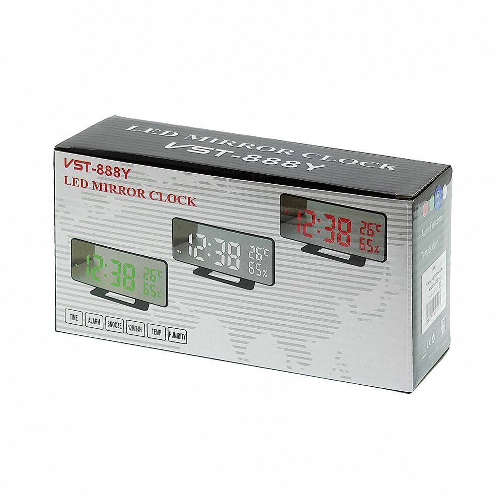 Настольные часы VST с зеркальным дисплеем, яркой подсветкой и тремя будильниками. Питание от разъема USB 5V (шнур J3,5xUSB в комплекте, блок питания в комплект не входит). Идеальное решение для Вашего интерьера. Автоматическая регулировка яркости по времени (с 18:00 до 7:00 подсветка автоматически становится менее яркой). Часы отображают время, дату, температуру и влажность воздуха в комнате.