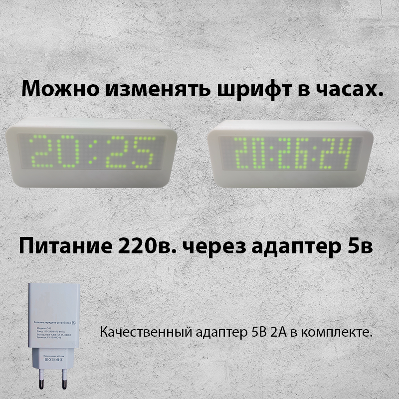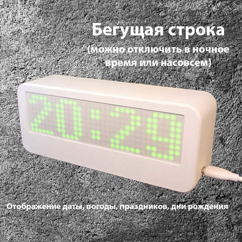 Для работы часов требуется интернет. Всегда точное время: Коррекция времени по WIFI. Автоматическая регулировка яркости (15 порогов яркости). Ручная регулировка яркости. Через определенное время в часах появляется бегущая строка, которая показывает: Календарь, День недели, Температура на улице, Погода на улице (дождь, солнце), Влажность на улице, Атмосферное давление, Направление ветра, Официальные государственные и церковные праздники. Есть специальный ночной режим, в котором часы показывают только время. Регулировка часов происходит со смартфона. Можно поменять любой параметр часов: Шрифт, время появления бегущей строки, отображать время с секундами или нет, яркость экрана, отображать погоду или нет. Погода легко настраивается для Вашей местности. При пропадании интернета часы могут работать автономно любое время. Интернет нужен при включении часов для установки времени.