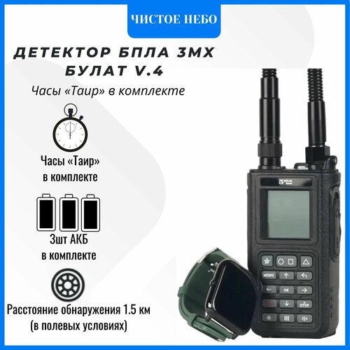 Устройство оповещения о БПЛА «Таир», принимающее сигналы об обнаруженных беспилотниках от всенаправленного детектора дронов «Булат» v.4. Устройство автоматически подключается по беспроводной связи BLE (Bluetooth Low Energy) к всенаправленному детектору дронов «Булат» v.4.«Таир» сопрягается со всеми обнаружителями в радиусе действия связи — порядка 50 метров. Одно устройство оповещения может попеременно принимать сигналы от нескольких дрон-детекторов. Один «Булат» 4-й версии, в свою очередь, может передавать данные о БПЛА сразу нескольким «Таирам». При обнаружении беспилотника «Булат» v.4 отправляет все данные по Bluetooth на дисплей «Таира». В результате на экране устройства отображаются тип или марка дрона, его частота и время последней детекции. «Таир» также оповещает об обнаружении дрона вибросигналом.