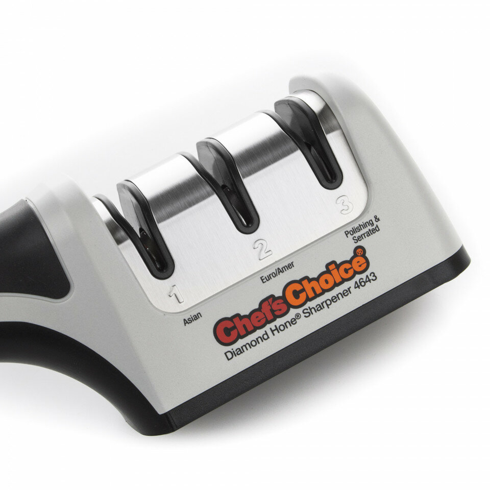 Точилка механическая для европейских и азиатских ножей Chefs Choice Knife sharpeners CC4643 Механические устройства для заточки ножей и ножниц, выпускаемые под торговой маркой Chef’s Choice по праву пользуются популярностью во всем мире. Запатентованная система выдержки угла заточки и 100% алмазные абразивы помогут быстро привести лезвия ваших ножей в идеальное состояние. Характеристики: вид упаковки: блистер гарантия (лет): 1 количество этапов заточки: 3 материал абразива: алмаз материал корпуса: пластик предметов в наборе (штук): 1 угол заточки (градусы): комбинированный (15 и 20) прорезиненные ножки стадия основной заточки стадия доводки/поллировки С чего начинается хороший нож? Безусловно, с идеально подобранного материала, с современных технологий производства, с безупречной балансировки и заводской заточки. Однако когда он перестает быть новым, огромное значение приобретает инструмент, с помощью которого ножу возвращается острота. И тогда на помощь приходят механические и электрические точилки американского бренда Chef's Choice.