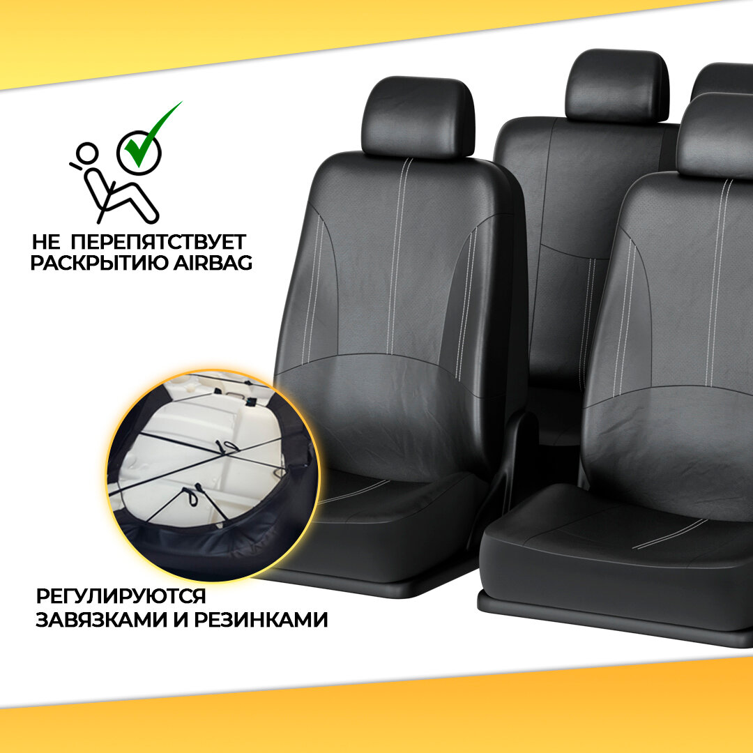 внимание! Складки на чехлах разглаживаются в течение нескольких суток после их установки на сиденья. Не торопитесь оставлять негативный отзыв. Удобное фактурное покрытие легко очищается с помощью обычной влажной салфетки из микрофибры. Искусственная эко кожа имеет привлекательный внешний вид, она такая же фактурная и приятная на ощупь, как и натуральная кожа. Материал обладает влагоотталкивающими свойствами, он устойчив к износу и долговечен. Чехлы имеют чередующееся фактурное покрытие: вставки из гладкого материала и вставки из перфорированного материала на кресле и спинке. Маленькие отверстия способствуют воздухообмену и отведению тепла. Специальные прострочки на кожзаме позволяют использовать автоаксессуары в автомобиле, оборудованном подушками безопасности AirBag. Накидки на сиденье автомобиля легко установить самостоятельно и они мягкие, все необходимые крепления есть в комплекте.