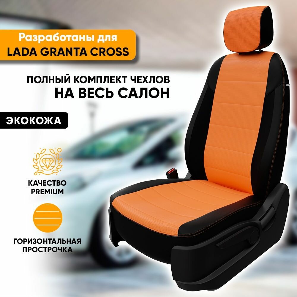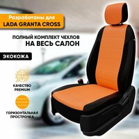 Купить Чехлы для автомобильных сидений Lada Granta Cross / Лада Гранта Кросс (2018-наст. время) из экокожи, цвет черный + оранжевый, задняя спинка раздельная 40/60 (комплект авточехлов) с доставкой по всей России.