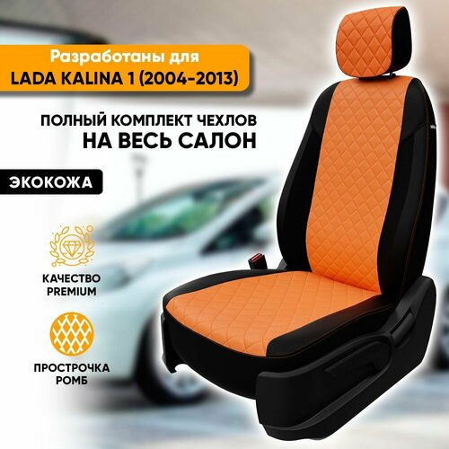 Чехлы для автомобильных сидений Lada Kalina / Лада Калина (2004-2013) из экокожи «Ромб», цвет черный + оранжевый, кроме комплектации Sport (комплект авточехлов на весь салон): сравнение цен, характеристики, фото, актуальное наличие и цены.