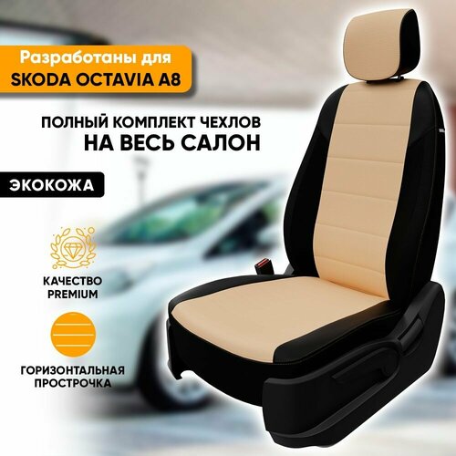 Чехлы для автомобильных сидений Skoda Octavia A7 / Шкода Октавия А7 (2013-2020) из экокожи, цвет черный + бежевый, без заднего подлокотника (комплект авточехлов на весь салон): сравнение цен, характеристики, фото, актуальное наличие и цены.